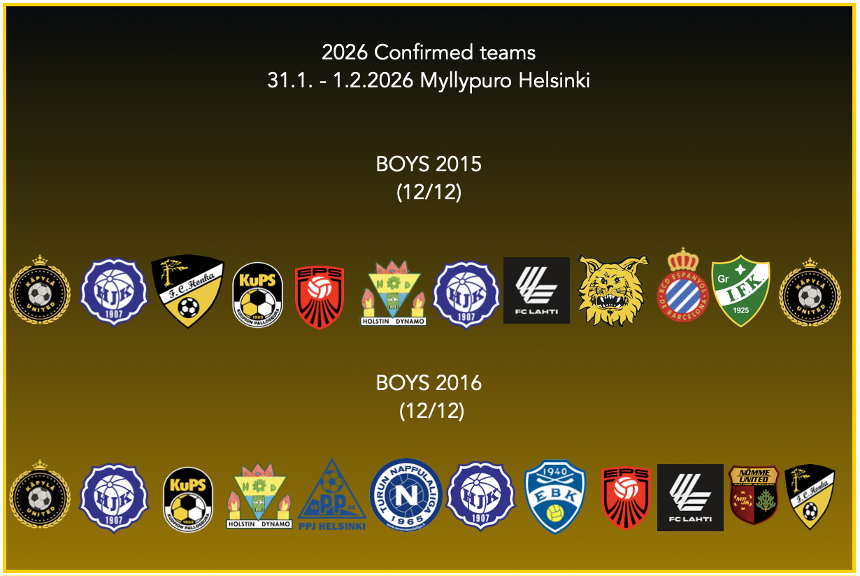 Turnauksen yhteyshenkilöt : Ilmoittautuminen/ruokailut -> timo@kapylaunited.fi (Timo Maakannas) ja ohjelma jenna@kapylaunited.fi (Jenna Hupli). 2026 Turnaukseen rekisteröityneet joukkueet listataan tähän alle.