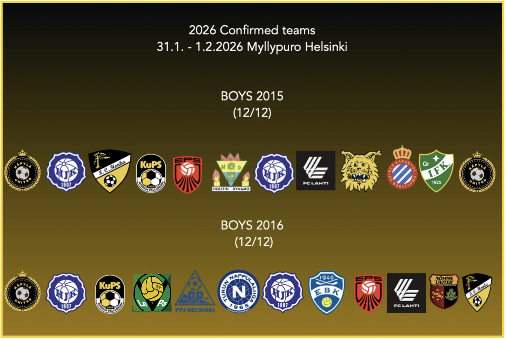 Käpylä United järjestää kolmannen kerran 7v7 kutsuturnauksen 2015 - ja 2016 käluokalle 31.1.-1.2.2026 Myllypuron uudistetussa jalkapallohallissa. Turnauksen yhteyshenkilöt : Ilmoittautuminen/ruokailut -> timo@kapylaunited.fi (Timo Maakannas) ja ohjelma jenna@kapylaunited.fi (Jenna Hupli). 2026 Turnaukseen rekisteröityneet joukkueet listataan tähän alle.